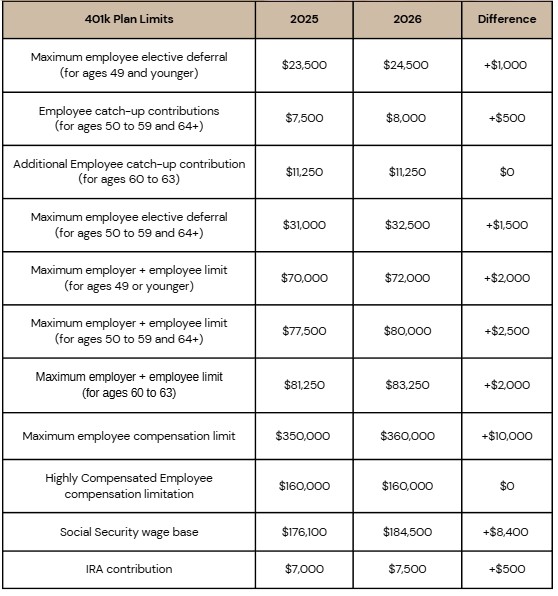 The IRS periodically adjusts contribution limits for retirement accounts to reflect inflation, and 2026 is no exception. Election and catch-up contribution limits increase, giving you more room to save on a tax-advantaged basis.²